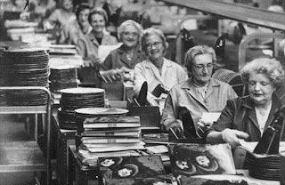 3. That it's quite possible [in a chrono-anal-retentive variation of the butterfly effect] that, in looking up from their work to smile for the camera, Marjorie and Judith [third and fourth from the front, respectively] damaged the copies they were putting together, thus sending those lost RUBBER SOULs out into the world with no chance of ever being Mint condition.